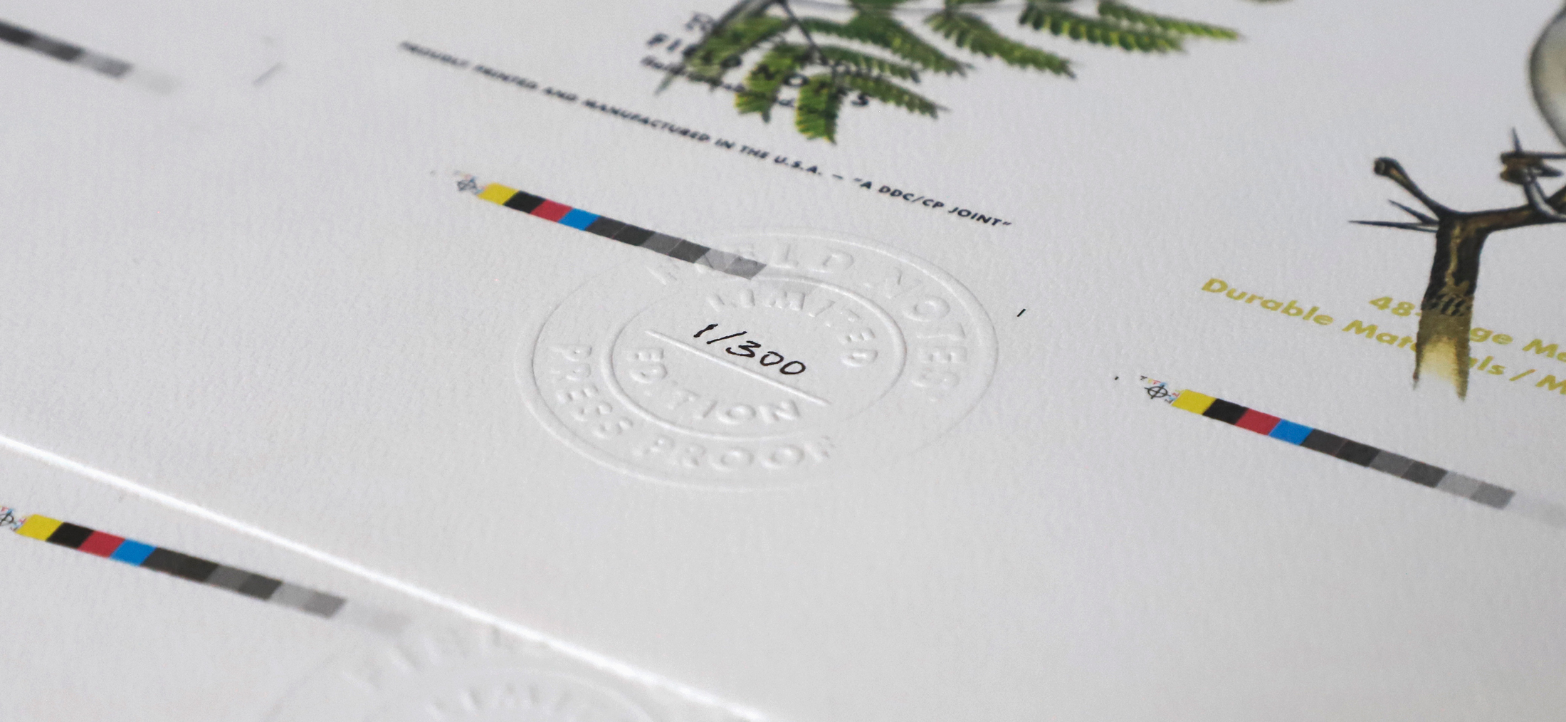 The unified color palette and texture of the cover stock fits Rex Brasher’s delicate ink-and-watercolor illustrations perfectly, and makes for one our most attractive Press Sheets ever.