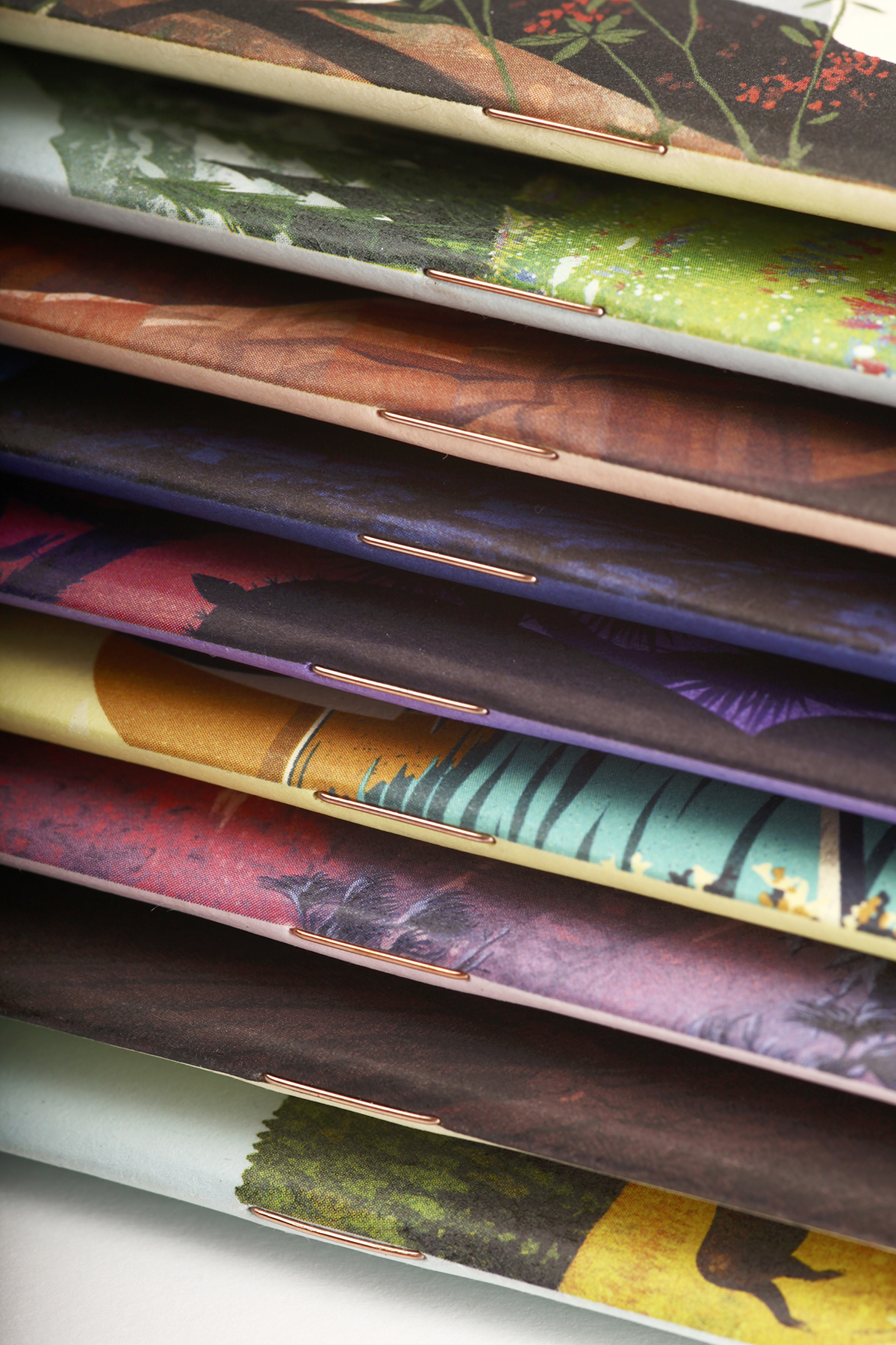 The covers are printed on a variety of colored 100-lb. cover stocks from the French Paper Company of Niles, Michigan, using a custom, five-color process that started with under-printing white ink. This allowed us to incorporate the color of the paper into the artwork. The illustrative styles, the printing process, and the copper staples recall the heritage, and archival promotional materials and publications, of the National Park System.